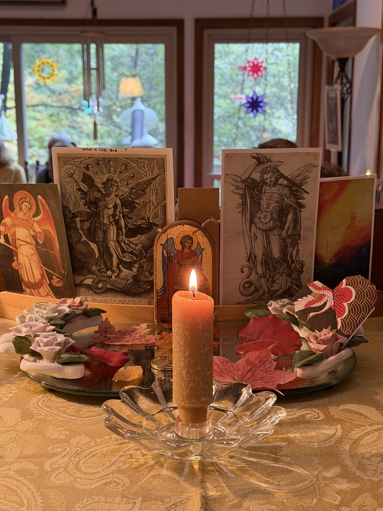 Rudolf Steiner Branch members and friends gathered to celebrate Michaelmas by exploring the verse by Rudolf Steiner, “See the Sun at the Midnight Hour”, as a preparation for the Holy Nights. Rudolf Steiner gave several lectures over the years around Christmas time linking this esoteric verse with the sacred process of Initiation to spiritual knowledge. Steiner also gave a specific form and indications how this verse should be presented in eurythmy. These indications give profound insights into the process of spiritual development both in the ancient Mysteries and for us today. This celebration was supported by a grant from the Anthroposophical Society in America. Many thanks to Annie Haas for the photographs.